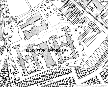 In 1898-1900, Islington developed a workhouse infirmary at a site on Highgate Hill, already occupied by the Highgate Smallpox and Vaccination Hospital. This hospital had been erected in 1848-50 as a replacement for an earlier smallpox hospital near Battle Bridge in St Pancras which was demolished as part of the King’s Cross station development by the Great Northern Railway. The new building, designed by Samuel Daukes on what was the a “green field” site, has 108 beds and continued in use until 1896 when a new and larger smallpox hospital was opened at South Mimms in around 1896.