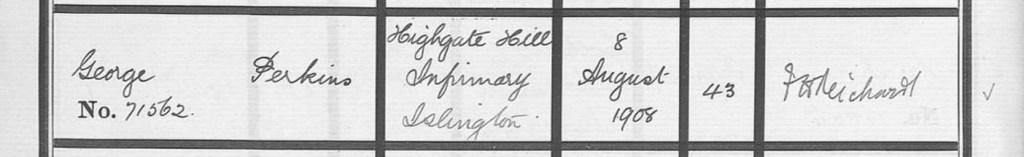 Susans husband, 43 year old, General Labourer, George Parkins, passed away on Saturday the 1st of August 1908, at Islington Infirmary, Highgate Hill, Islington, Middlesex, England.