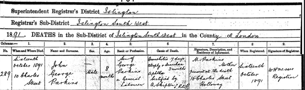 Heartbreak followed when Susan and George’s son, 8 month old, John George Parkins, sadly passed away, on Wednesday the 16th of October 1891, at home, Number 10, Charles Street, South West Islington, London, England. John died from Bronchitis 7 days, atrophy and Diarrhoea 3 months and Aphtha.