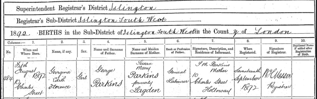 Susan and George Parkins daughter, Georgina Edith Florence Parkins, was born on Wednesday the 5th of August 1892, at Number 10, Charles Street, South West Islington, London, England. Her mother Susan Mary Parkins, registered her birth on Thursday the 17th of September 1892. She gave Georgina’s fathers name and occupation as, George Parkins, a General Labourer.