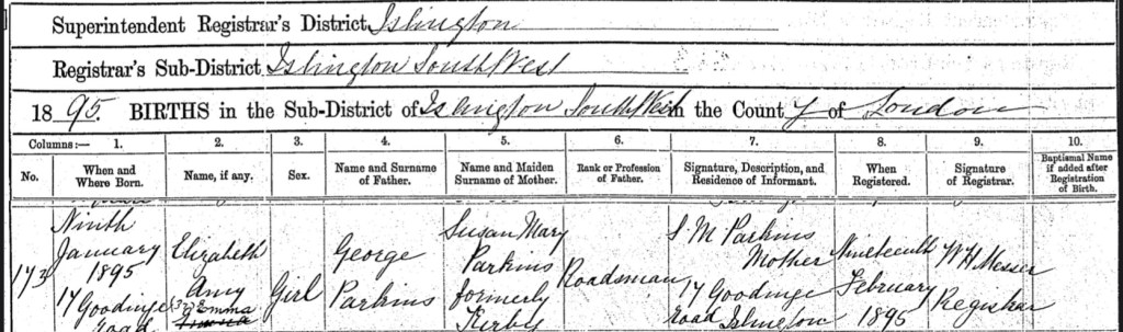 And a few year later, on Monday the 9th of January, 1895, Susan Mary, gave birth to Elizabeth Amy Emma Parkins, at home, Number 17 Goodinge Road, Islington, London, England.
