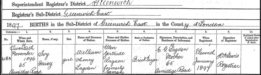 Ellen registered Ivy’s birth in Greenwich, on Monday the 11th of January 1897.