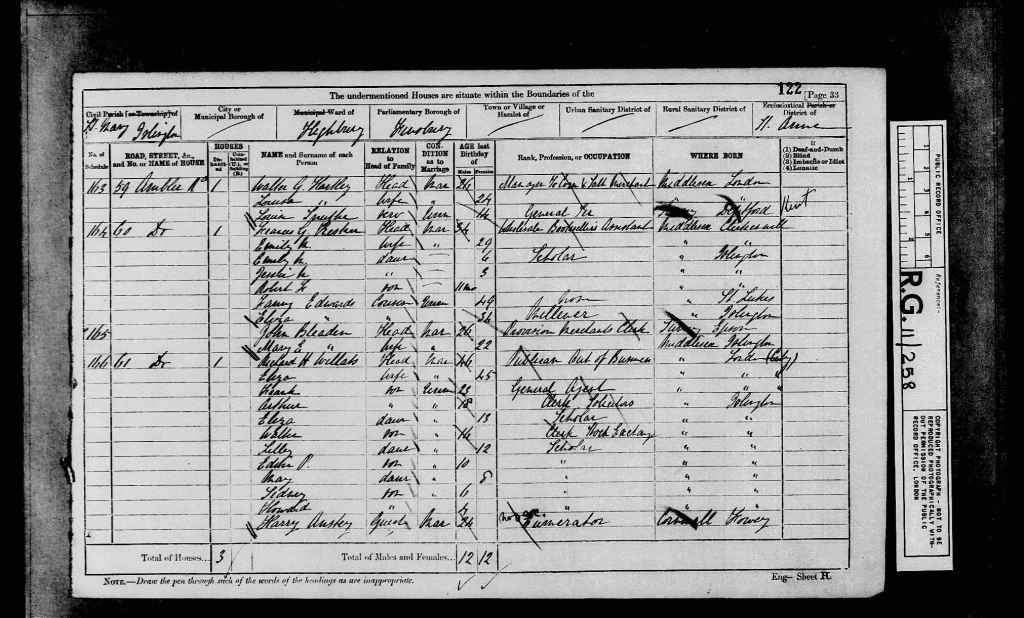 Francis, his parents Richard, Eliza, and his siblings, Walter, Henry, Eliza, Lillian, Edith, George and Charlotte, were residing at, Number 5, Park Road, Islington, Middlesex, England, on Sunday the of 2nd April 1871. Richard was working as a Dealer in feathers. The family had two General Servants, residing with them, Jemima Roac and Caroline Curry.