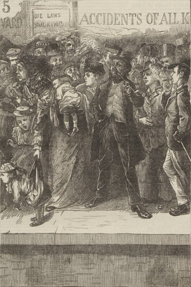 Waiting on a crowded platform is nothing new, as this drawing of August Bank Holiday from 1881 shows. Fortunately, smoking was banned decades ago. Penny Illustrated Paper, 6 August 1881. (c) The British Library Board, all rights reserved.