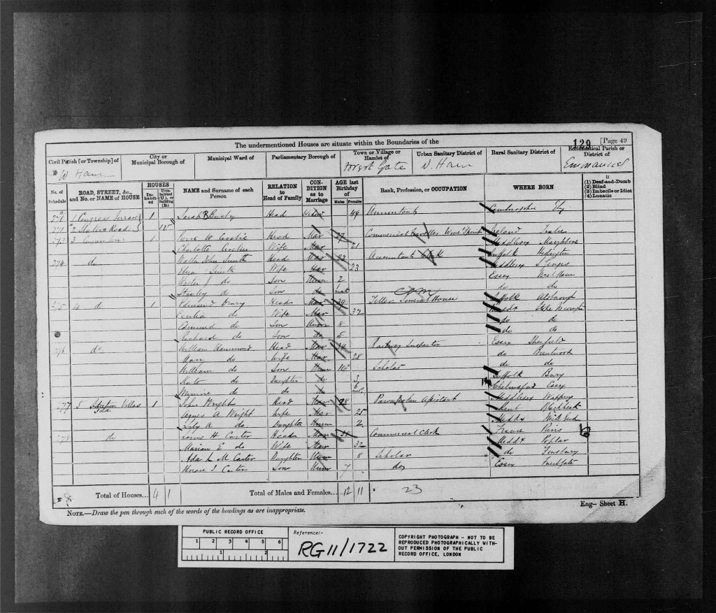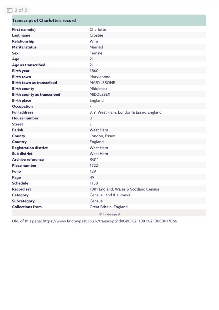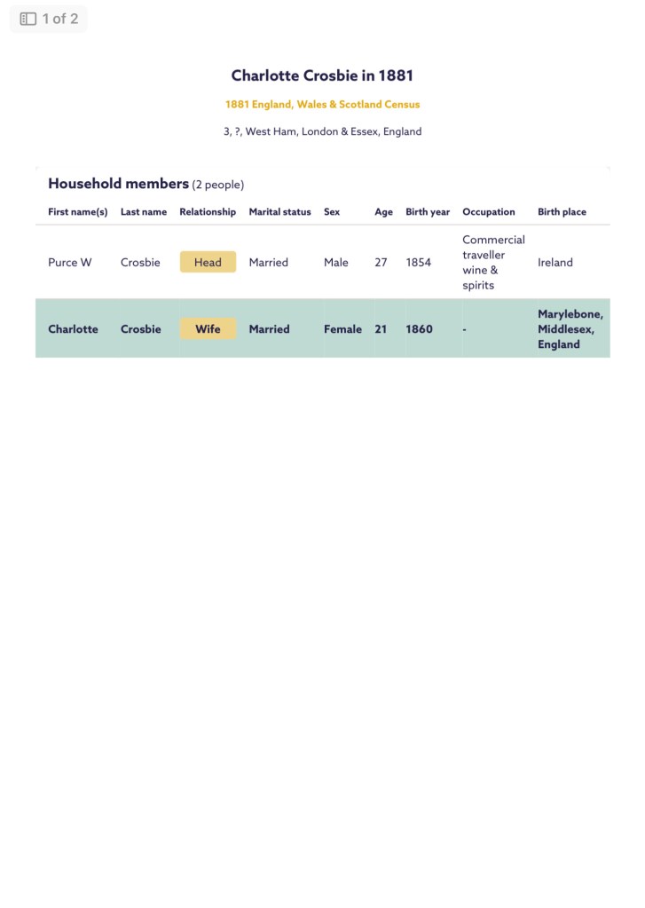 And on Sunday the 3rd of April, 1881, the census was taken, which shows, Charlotte and her new husband Pierce, were residing at Number 3, Congress Terrace, Forest Gate, West Ham, Essex, England. The address is far from clear but I believe it to be Congress Terrace. Charlotte’s husband was working as a Commercial Traveler of Wines and Spirits.