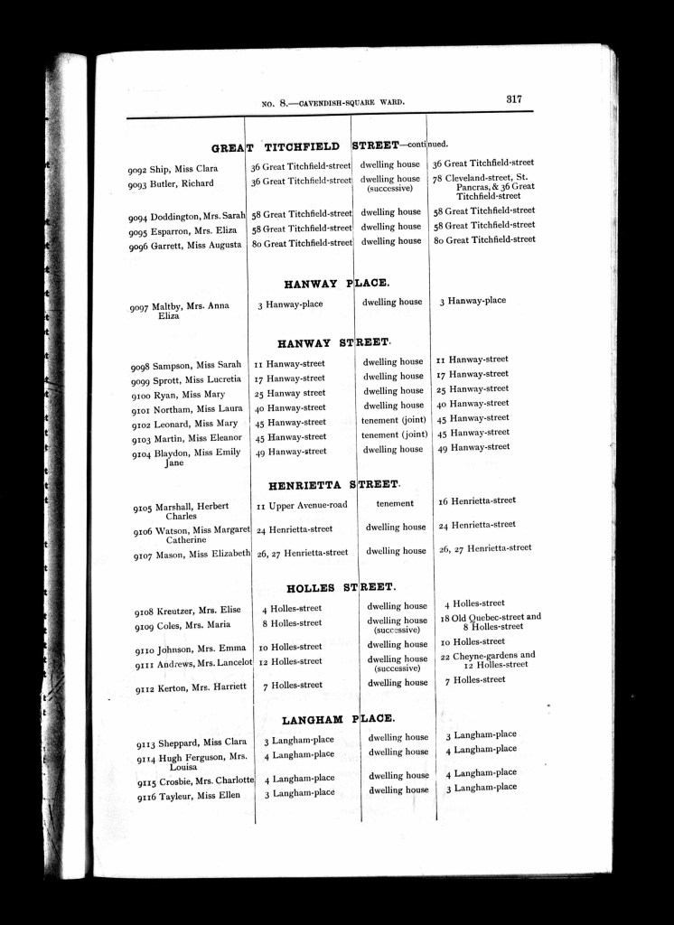 From the 1832-1965 London, England, Electoral Registers, we know, Charlotte was residing at 4 Langham Place, Marylebone East, Westminster, London, England, in 1897. Mrs Lousisa Hugh Ferguson, was also residing there.
