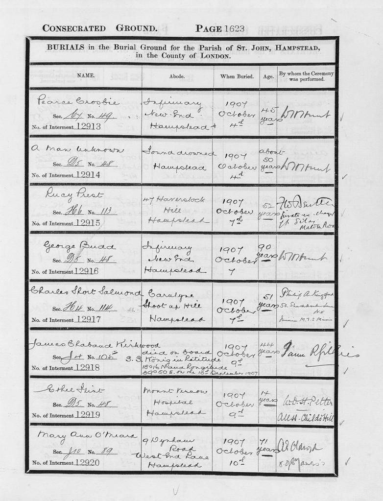 Charlotte’s possible child, Baby Crosbie was laid to rest on Tuesday the 9th of January 1917, at Abney Park Cemetery, Stoke Newington, Middlesex, England, in grave 127434 possibly renumbered 17434, (Grave Reference – Sec. I09, Index 7S08.) with Charlotte Ellen Crosbie, Amina Eliza Kathleen Reichert nee Charlton, Mabel Cameron Woollet Willats, and Eliza Smith.
