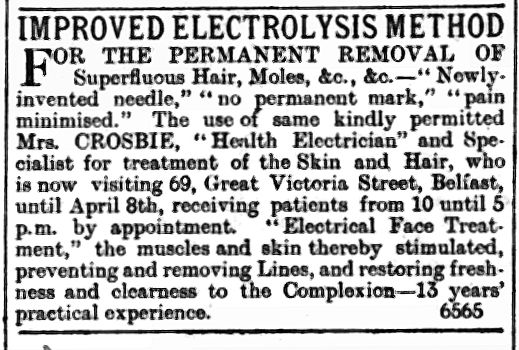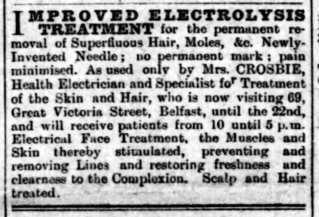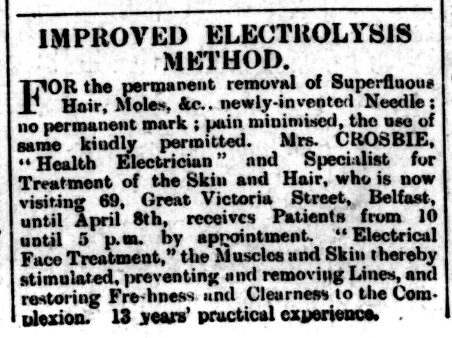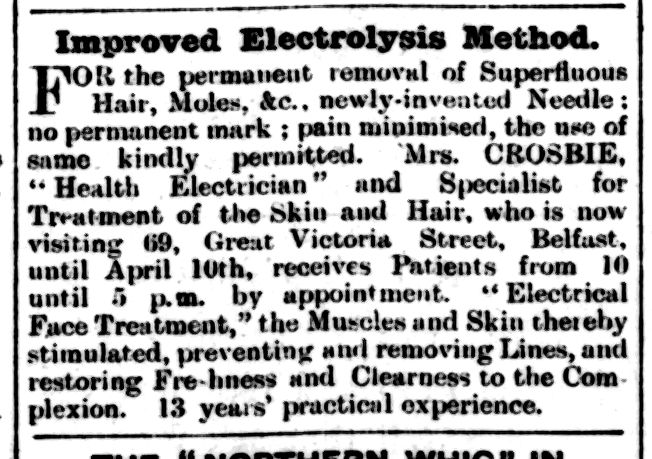 IMPROVED ELECTROLYSIS METHOD. For the permanent removal of Superfluous Hair, Moles, &c. . newly-invented Needle ; no permanent mark ; Pain minimised, the use of same kindly permitted. Mrs Crosbie, “Health Electrician” and Specialist for Treatment of the skin and Hair, who is now visiting 69, Great Victoria Street, Belfast, until April 10th, receives Patients from 10 until 5 p.m. by appointment. “Electrical Face Treatments, “ the Muscles and Skin thereby stimulated, preventing and removing Lines, and restoring Freshness and Clearness to the Com- plexion. 13 years experience.