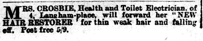 MRS. CROSBIE, Health and Toilet Electrician, of 4, Langham-place, will forward her “NEW HAIR RESTORER” for thin weak hair and falling off. post free 5/9.
