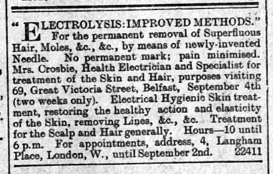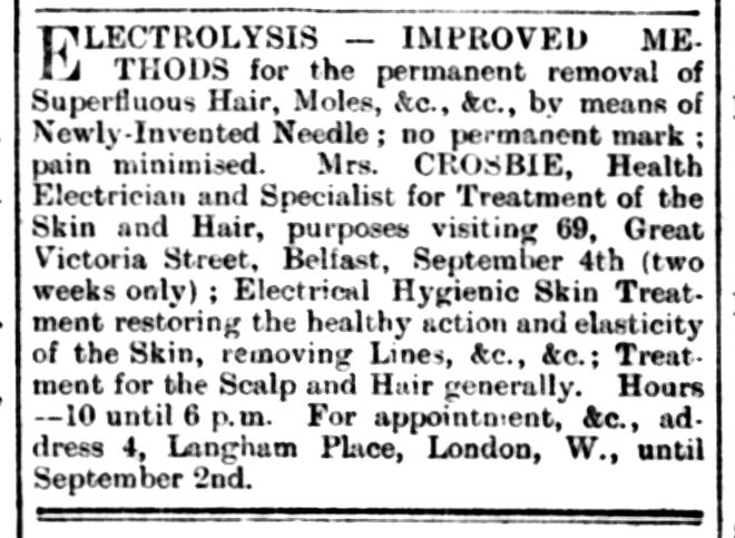 “ELECTROLYSIS – IMPROVED METHODS.” for permanent removal of Superfluous Hair, Moles, &c., &c. , by means of Newly-Invented Needle. No permanent mark; pain minimised. Mrs. CROSBIE, Health Electrician and Specialist for treatment of the Skin and Hair, purposes visiting 69, Great Victoria Street, Belfast, September 4th (two weeks only). Electrical Hygienic Skin treat- ment restoring the healthy action and elasticity of the skin, removing Lines, &c. , &c. Treatment for Scalp and Hair generally. Hours – 10 until 6 p.m. For appointment, address 4, Langham Place, London, W., until September 2nd. 22411