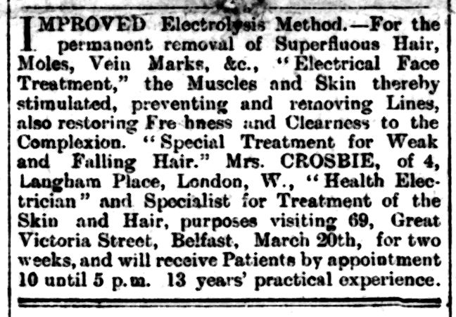 IMPROVED ELECTROLYSIS METHOD. FOR THE PERMANENT REMOVAL OF Superfluous Hair, Moles, &c.- “Electrical Face Treatment,” the muscles and skin thereby stimulated, preventing and removing Lines, also restoring freshness and clearness to the Complexion, “Special Treatment for Weak and Falling Hair.” Mrs. CROSBIE, of 4, Langham Place, London, W., Health Electrician and Specialist for treatment of the Skin and Hair, purposes visiting 69, Great Victoria Street, Belfast, March 20th, for two weeks, and will receive patients by appointment – 10 until 5 p.m. 13 years practical experience. 6565