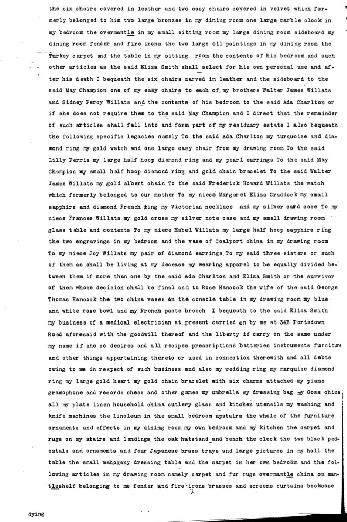I CHARLOTTE ELLEN CROSBIE of 34B Portsdown Road Maida Vale in the County of London Widow hereby revoke all wills and testamentary dispositions heretofore made by me and declare this to be my last will I desire to be buried in the grave belonging to me at Abney Park Cemetery which I bequeath to my dear friend and companion Eliza Smith so that she may be buried with me I appoint my brother Henry Richard Willats and my — friend George Thomas Hancock of 50 Fairholt Road Stoke Newington in the County of London Eequire to be the EXECUTORS and trustees of this my will and they or other the trustees or trustee for the time being of this my will are hereinafter referred to as “my trustees or trustee” And in the event of either of them dying in my lifetime or being unable or unwilling to act then I appoint my brother Walter James Willats to be an executor and trustee of my will and in the event of both of them dying in my lifetime or being unable or unwilling to act then I appoint the said Walter James Willats and my brother Frederick Howard Willats to be the executors and trustees of my will I give tothe said George Thomas Hancook the sum of twenty five guineas if he shall accept the office of executor and trustee I bequeath the following legacies to be paid immediately after my decease namely To my sisters Ada Charlton Lilly Ferris and May Champion and the said Eliza Smith and Henry Richard Willats as a small memento and to my brothers Arthur Charles Willats, Walter James Willats, Sidney Percy Willats and Frederick Howard Willats the sum of ten pounds each in addition to the foregoing legacies I bequeath the following legacies to be paid as soon as conveniently may be after my decease namely To my said three sisters and five brothers and the said Eliza Smith the sum of ninety pounds each And I direct that if any one or more of my said sisters and brothers and the said Eliza Smith shall die in my lifetime the additional legacy or legacies bequeathed to such one or more of them so dying shall be divided equally between such of them as shall be living at my decease I also bequeath to Nellie Willats the widow of my late brother Edwin Willats the sum of twenty pounds if she shall-not have married again at my decease I also give to any of my said brothers and sisters any sum of money which may be owing by him or her to me at my decease I bequeath to my father the use during his life of the six chairs covered in leather and two easy chairs covered in velvet which formerly belonged to him two large bronzes in my dining room one large marble clock in my bedroom the overmantle in my small sitting room my large dining room sideboard my dining room fender and fire irons the two large oil paintings in my dining room the Turkey carpet and the table in my sitting room the contents of his bedroom and such other articles as the said Eliza Smith shall select for his own personal use and after his death I bequeath the six chairs carved in leather and the sideboard to the said May Champion one of my easy chairs to each of my brothers Walter James Willats and Sidney Percy Willats and the contents of his bedroom to the said Ada Charlton or if she does not require them to the said May Champion and I direct that the remainder of such articles shall fall into and form part of my residuary estate I also bequeath the following specific legacies namely To the said Ada Charlton my turquoise and diamond ring my gold watch and one large easy chair from my drawing room To the said Lilly Ferris my large half hoop diamond ring and my pearl earrings To the said May Champion my small half hoop diamond ring and gold chain bracelet To the said Walter James Willats my gold albert chain To the said Frederick Howard Willats the watch which formerly belonged to our mother To my niece Margaret Eliza Craddock my small sapphire and diamond French ring my Victorian necklace and my silver card case To my niece Frances Willats my gold cross my silver note case and my small drawing room glass table and contents To my niece Mabel Willats my large half hoop sapphire ring the two engravings in my bedroom and the vase of Coalport china in my drawing room To my niece Joy Willats my pair of diamond earrings To my said three sisters or such of them as shall be living at my decease my wearing apparel to be equally divided between them if more than one by the said Ada Charlton and Eliza Smith or the survivor of them whose decision shall be final and to Rose Hancock the wife of the said George Thomas Hancock the two china vases on the console table in my drawing room my blue and white rose bowl and my French paste brooch I bequeath to the said Eliza Smith my business of a medical electrician at present carried on by me at 34B Portsdown Road aforesaid with the goodwill thereof and the liberty to carry on the same under my name if she so desires and all recipes prescriptions batteries instruments furniture and other things appertaining thereto or used in connection therewith and all debt owing to me in respect of such business and also my wedding ring my marquise diamond ring my large gold heart my gold chain bracelet with six charms attached my piano gramophone and records chess and other games my umbrella my dressing bag my Goss china all my plates linen household china cutlery glass and kitchen utensils my washing and knife machines the linoleum in the small bedroom upstairs the whole of the furniture ornaments and effects in my dining room my own bedroom and my kitchen the carpet and rugs on my stairs and landings the oak hatstand and bench the clock the two black pedestals and ornaments and four Japanese brass trays and large pictures in my hall the table the small mahogany dressing table and the carpet in her own bedroom and the following articles in my drawing room namely carpet and fur rugs overmantle china on mantleshelf belonging to me fender and fire irons brasses and screens curtains bookcase with contents one large and one smaller inlan