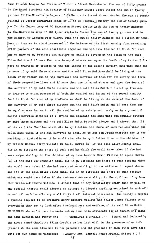 to the charitable bequests contained in my said will in accordance with my original intentions Now I hereby revoke the pecuniary legacies which my said will I have directed my trustees or trustee to pay upon the death of the said Eliza Smith out of the first annuity fund mentioned in my said will to the Society for Disabled Soldiers St Dunstans Hostel for Blinded Soldiers and Sailors the Dumb Friends League for Horses the Royal Surgical Aid Society the Mission to Lepers Doctor Barnardos Homes the Church Army the Salvation Army and the Bishop of London Poor Clergy Fund and I direct that upon the death of the said Eliza Smith my trustees or trustee shall stand possessed of the whole of the first annuity fund in trust for such one or more of my brothers and sisters as shall be then living and if more than one in equal shares And in all other respects I confirm my said will IN WITNESS whereof I have hereunto set my hand this sixth day of June one thousand nine hundred and twenty three CHARLOTTE E CROSBIE