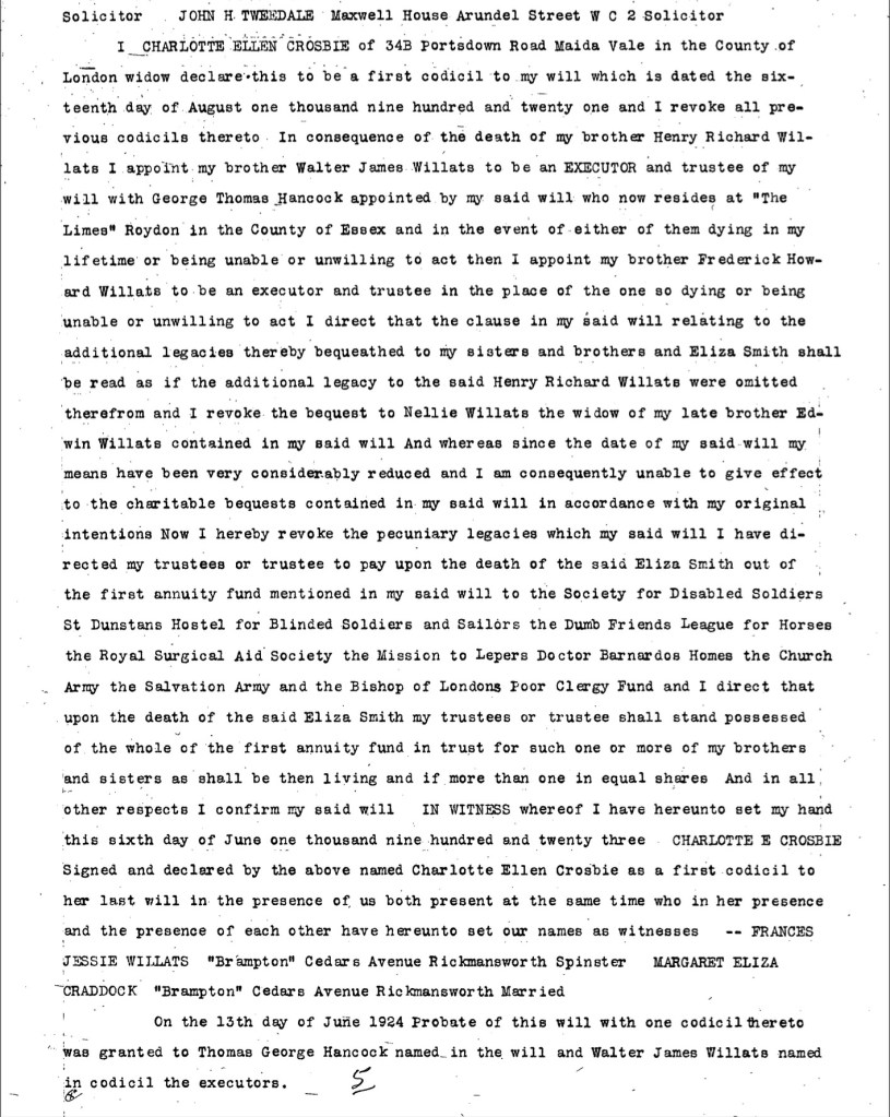 I CHARLOTTE ELLEN CROSBE of 34B Portsdown Road Maida Vale in the County of London widow declare this to be a first codicil to my will which is dated the sixteenth day of August one thousand nine hundred and twenty one and I revoke all previous codicil thereto In consequence of the death of my brother Henry Richard Willats I appoint my brother Walter James Willats to be an EXEOUTOR and trustee of my will with George Thomas Hancock appointed by my said will who now resides at *The Limes'” Roydon in the County of Essex and in the event of either of them dying in my lifetime or being unable or unwilling to act then I appoint my brother Frederick Howard Willats to be an executor and trustee in the place of the one so dying or being unable or unwilling to act I direct that the clause in my said will relating to the additional legacies thereby bequeathed to my sisters and brothers and Eliza Smith shall be read as if the additional legacy to the said Henry Richard Willats were omitted therefrom and I revoke the bequest to Nellie Willats the widow of my late brother Edwin Willats contained in my said will And whereas since the date of my said will my means have been very considerably reduced and I am consequently unable to give effect