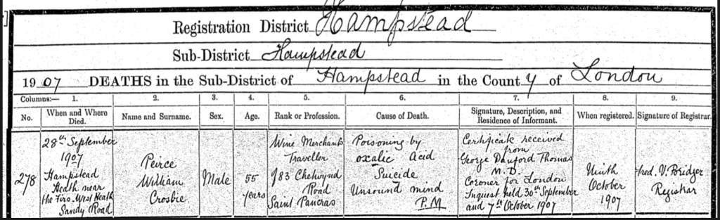 A newspaper paper article, about the suicide of Charlotte’s husband, Pearce Crosbie, was printed on the 12th of October 1907, in the Hampstead & Highgate Express.