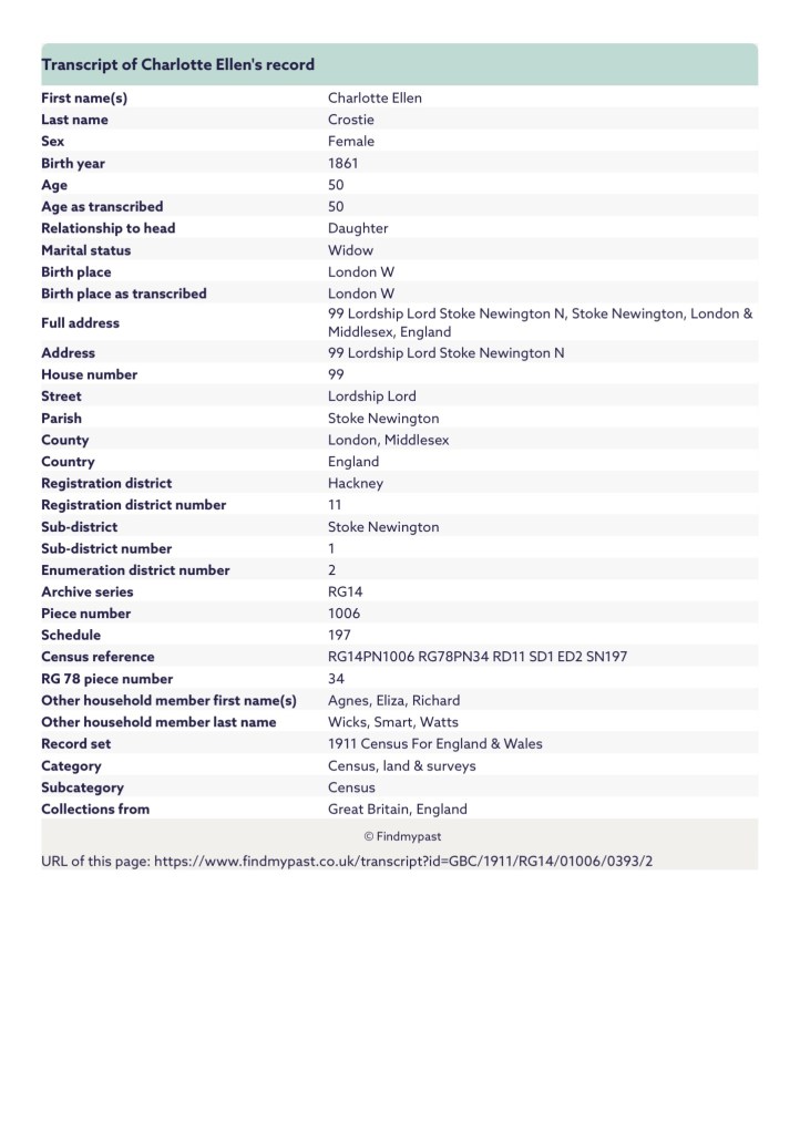 It was also the year of the 1911 census, which was taken on Sunday the 2nd of April 1911. It shows Charlotte Ellen Crosbie, now a widow, and her father Richard H Willats, residing at, Number 99, Lordship Road, Stoke Newington North, Stoke Newington, Middlesex, England. Number 99, Lordship Road, Was an 11-room dwelling. They had a friend called Ellen Smart and a servant named Agnes Clara Wicks, residing with them. Richard was working as a Surveyor. Richard had filled out the section under Infirmity as “None Thank God.” 😂 Richard states that he was married for 41 years, had 13 children of which 11 were still living and two had died. Charlotte had been married for 30 years and had no children. Agnes was a widow and had been married under a year and had one living child. Ellen had never been married and had no children.