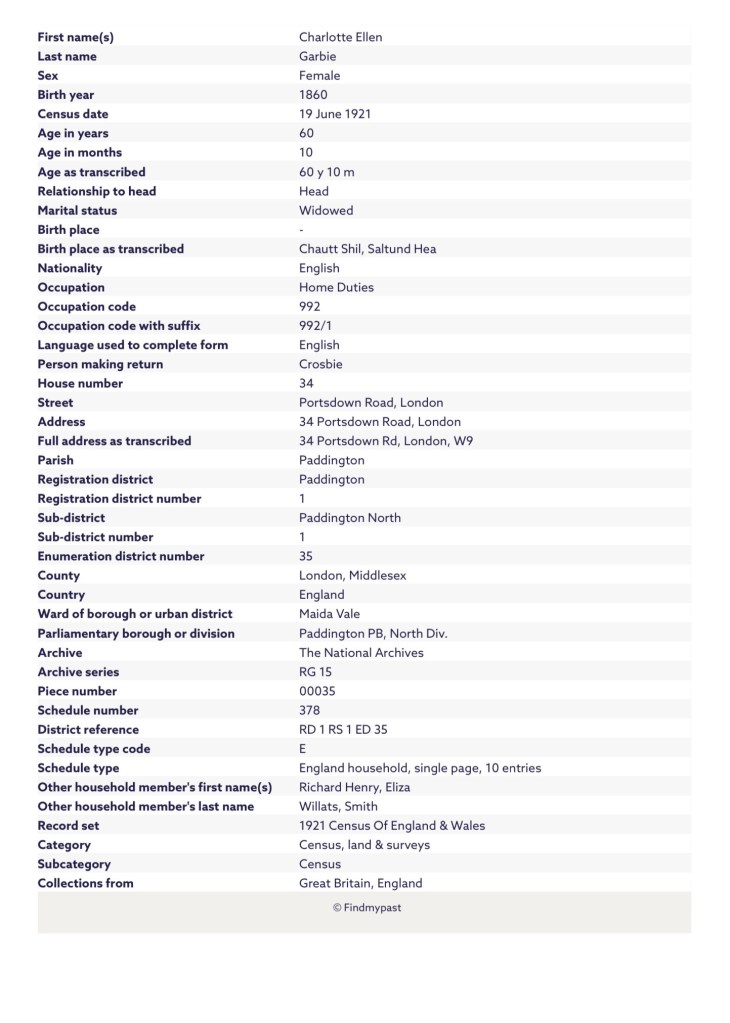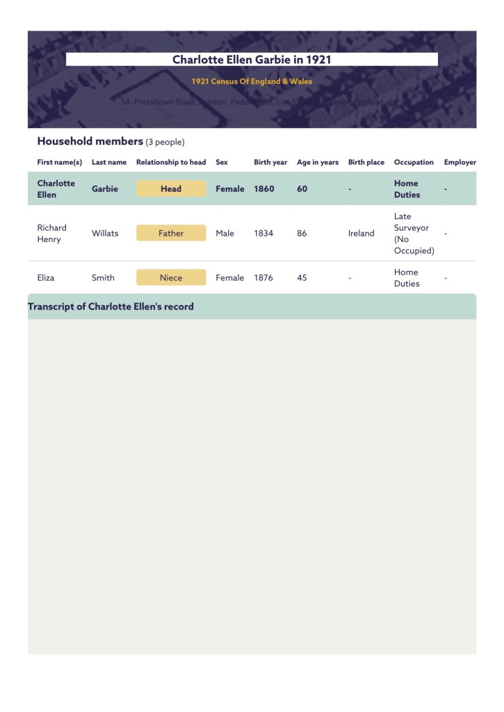 The 1921 London, England, Electoral Registers, confirms, Charlotte was residing at 34b, Portsdown Road, Paddington and St Marylebone, Westminster, London, England, in 1921, with her father, Richard Willats.