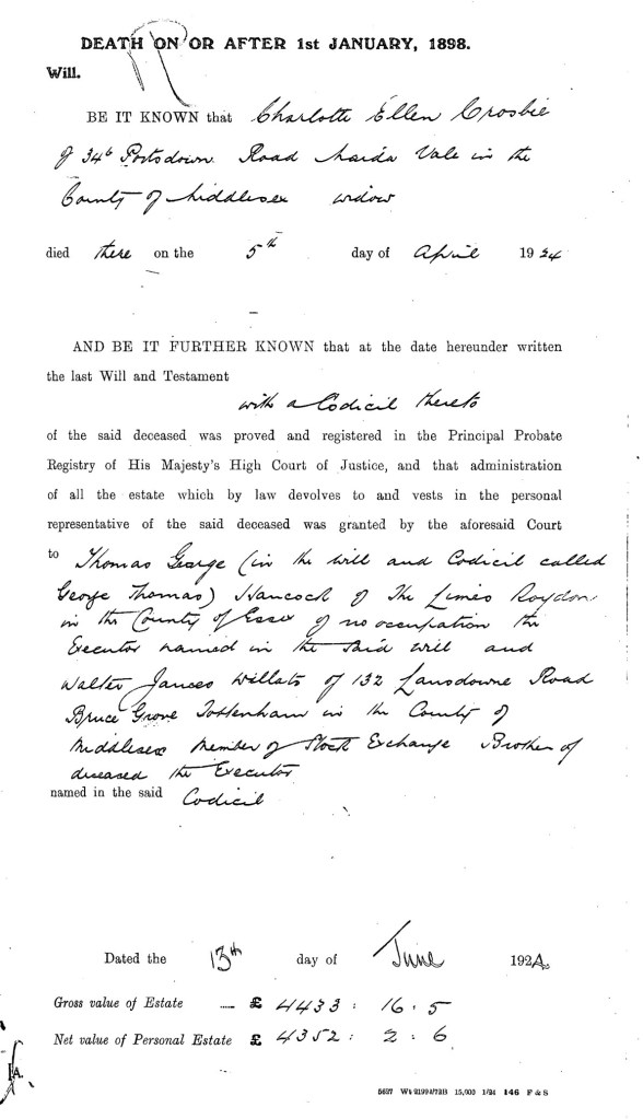 CROSBIE Charlotte Ellen of 34b Portsdown Road Maida Vale Middle- sex widow died 5 April 1924 Probate London 13 June to Thomas George Hancock of no occupation and Walter James Willats member of stock exchange. Effects £4433 16s. 5d.