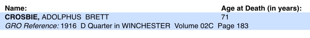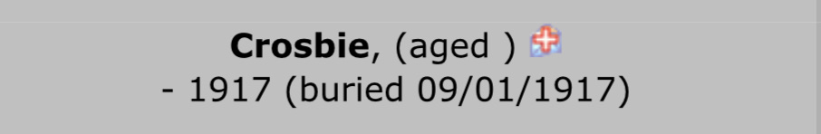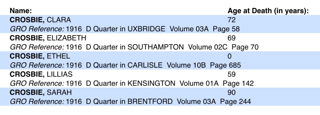Of course I could be barking up the wrong tree altogether so after a quick look at the death indexes for Crosbie’s whom died in the November to December quarter for 1916 and the January to March quarter of 1917, it could be anyone of these possibilities.