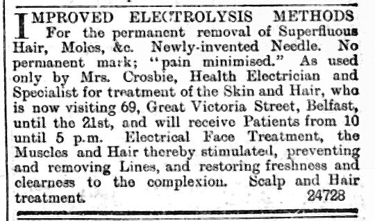 IMPROVED ELECTROLYSIS METHODS For permanent removal of Superfluous Hair, Moles, &c. Newly-Invented Needle. No permanent mark; pain minimised. As used only by Mrs. CROSBIE, Health Electrician and Specialist for Treatment of the Skin and Hair, who is now visiting 69, Great Victoria Street, Belfast, until the 21st and will receive patients from 10 until 5 p.m. Electrical Face Treatment the Muscles and Hair thereby stimulated, preventing , and removing Lines and restoring freshness and clearness to the Complexion. Scalp and Hair treatement. 24728