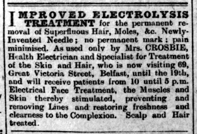 IMPROVED ELECTROLYSIS METHOD. For the permanent removal of Superfluous Hair, Moles, &c. . newly-invented Needle ; no permanent mark ; Pain minimised, the use of same kindly permitted. Mrs Crosbie, “Health Electrician” and Specialist for Treatment of the skin and Hair, who is now visiting 69, Great Victoria Street, Belfast, until April 8th, receives Patients from 10 until 5 p.m. by appointment. “Electrical Face Treatments, “ the Muscles and Skin thereby stimulated, preventing and removing Lines, and restoring Freshness and Clearness to the Com- plexion. 13 years experience.