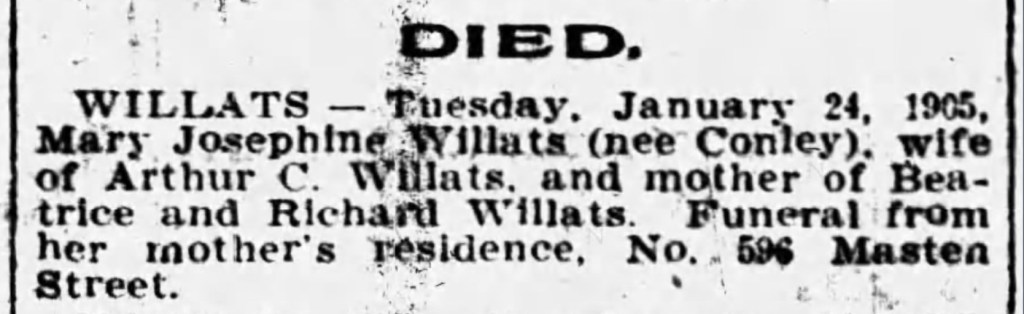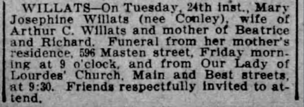 WILLATS-On Tuesday, the 24th inst., Mary Josephine Willats, (nee Conley), wife of Arthur C. Willats and mother of Beatrice and Richard. Funeral from her mother’s residence, 596 Masten Street, Friday morning at 9 o’clock, and from Our Lady of Lourdes Church, Main and Best Street,