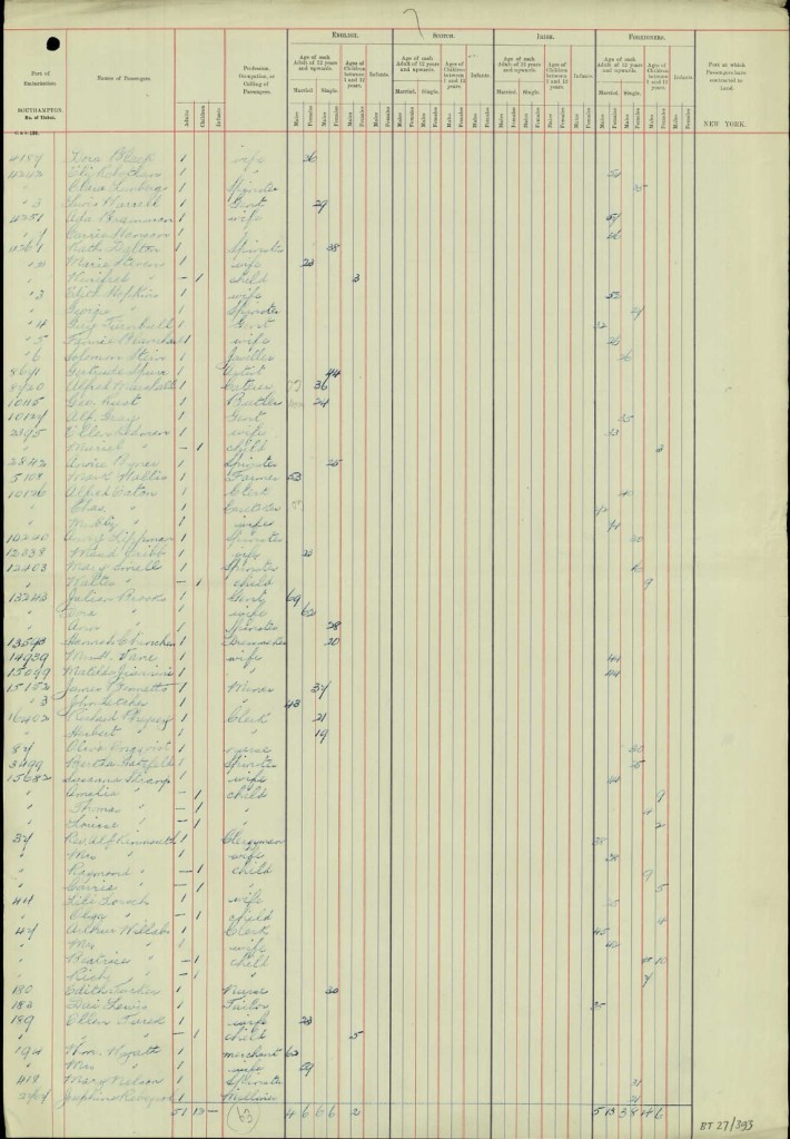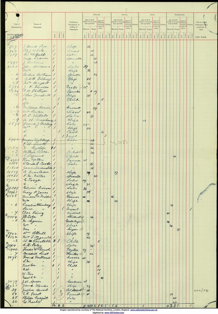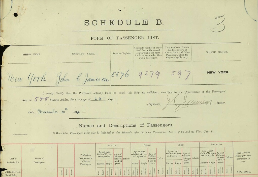 From the 1890-1960 UK and Ireland, Outward Passenger Lists, Arthur departed from Southampton Docks, Southampton, Hampshire, England, on Saturday the 10th of November 1894, aboard the Ship “New York.” He gave his occupation as a Labourer. The Master of the ship was named John C Jameson.
