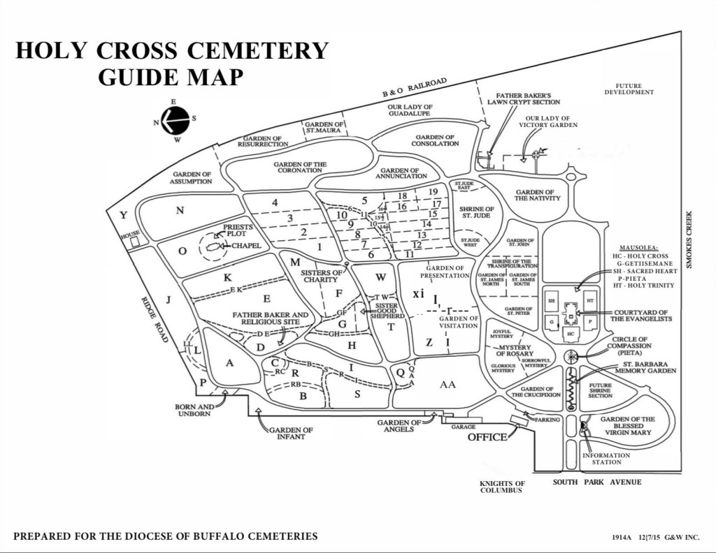 Holy Cross Cemetery is the largest of the Catholic cemeteries in the Diocese of Buffalo, consisting of approximately 191 acres. There are over 130,000 interments in this cemetery with approximately 60 acres of undeveloped land for future cemetery use.