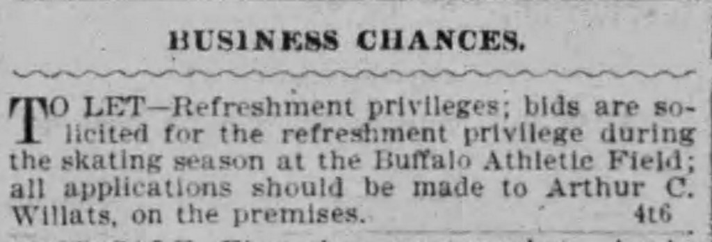 TO LET-Refreshment privileges; bids are solicited for the refreshment privilege during the skating season at the Buffalo Athlette Field; all applications should be made to Arthur C. Willats, on the premises.