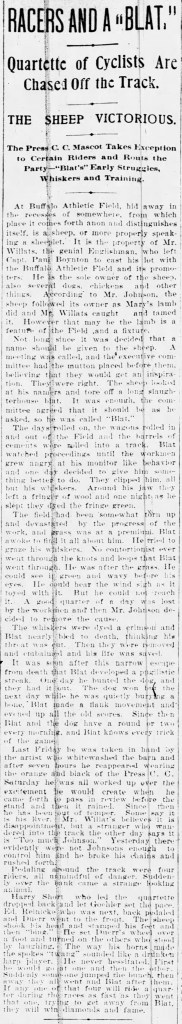 At Buffalo Athletic Field, hidden away in the recesses of somewhere, from which place it comes forth anon and distinguishes itself, is a sheep, or more properly speaking a sheeplet. It is the property of Mr. Willats, the genial Englishman, who left Capt. Pani Boynton to cast his lot with the Buffalo Athletic Field and its promotors: He is the sole owner of the sheep, several dogs chickens, and other things. According to Dr. Johnson. the sheep followed its owner as Mary's lamb did and Mr. Willats caught and tamed it. However that may be the lamb is a feature of the Field, and a fixture.