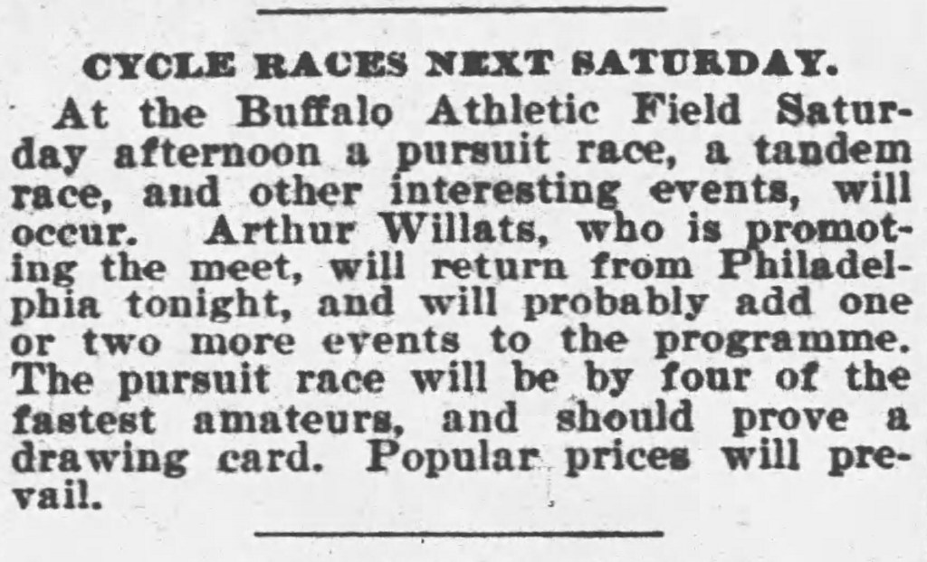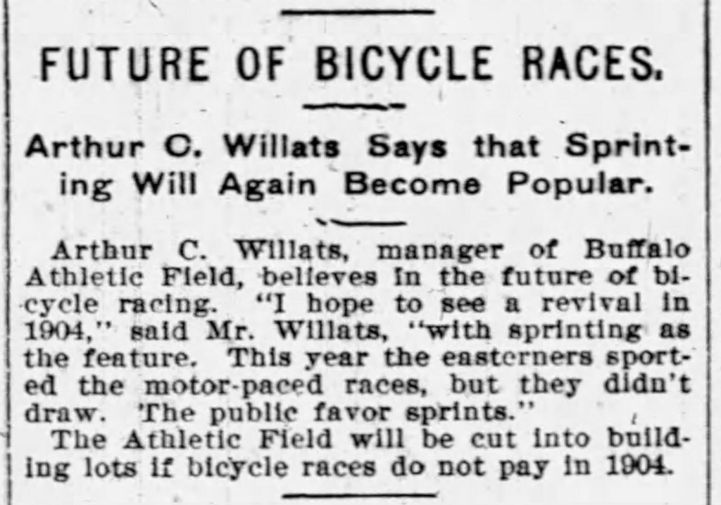 Arthur C. Willats, manager of Buffalo Athletic Field, believes in the future of Bicycle Racing. “I hope to see revival in 1904," said Mr. Willats, "with sprinting as the feature. This year the easterners sported the motor-paced races, but they didn't draw. The public favors sprints."
