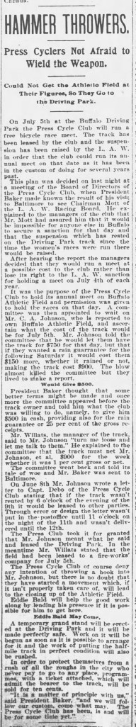 The grounds will be open for any kind of athletic engagements and considerable money is to be spent in putting the track and football portion in the best of condition. It is also intimated that a sprinting path may be constructed just inside the bike track.