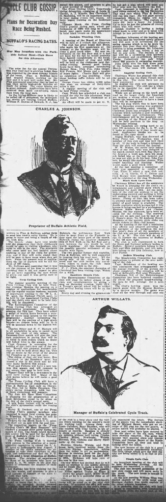 Now that Charles A. Johnson, the owner of Buffalo Athletic Field, has escaped the toils of his enemies by cleaning off the mortgages against his property, the perpetuation of the Field as an athletic ground is an assured fact and the cycling clubs of the town are casting envious eyes In its direction. One proposition that has been heard is that the Associated Cycling Clubs of Buffalo secure the management of the Field for the coming summer.