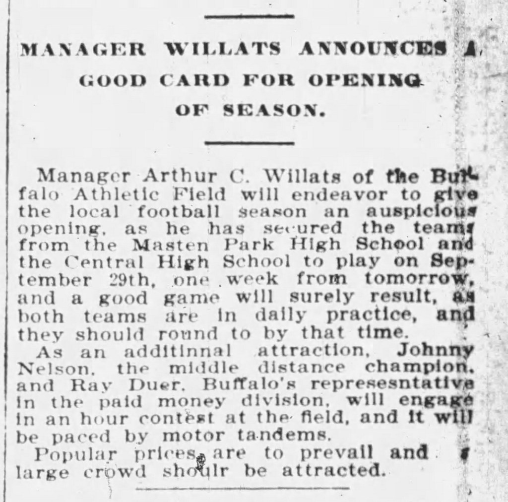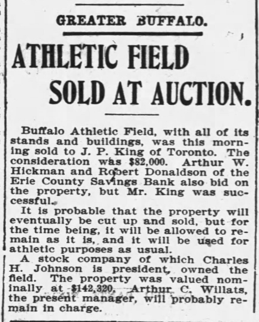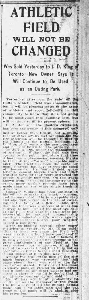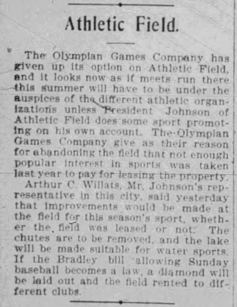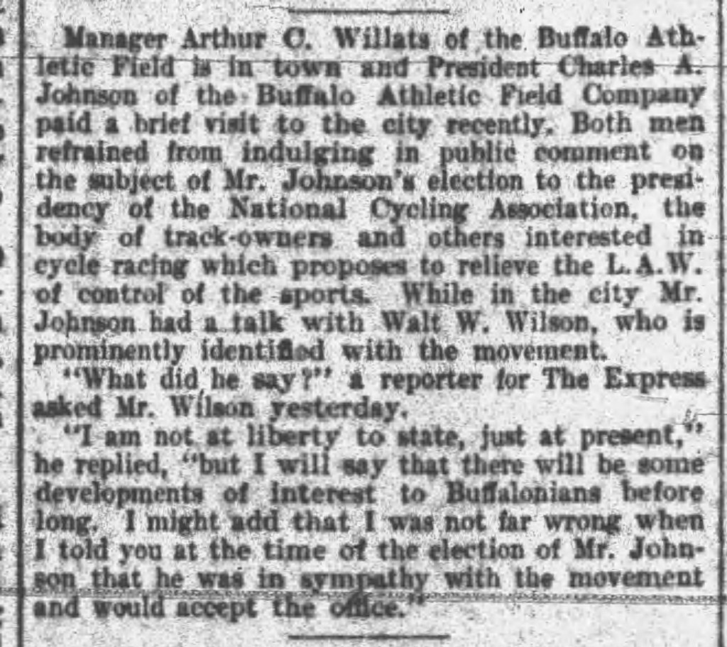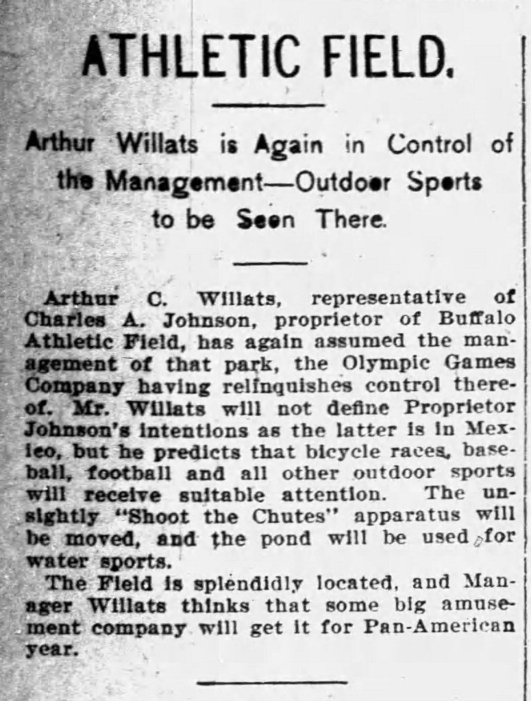 This might be a good scheme and no doubt would work well, but other arrangements have been made. TheNEWS knows from authoritative sources that Mr. Johnson will retain control of the Field himself this season, and proposes to make it even more popular than ever with cycling and athletic clubs. It is Mr. Johnson's intention to come to Buffalo and give the Field his personal supervision. He will have an office down town, while Arthur C. Willats will continue to act as his representative at the Field.