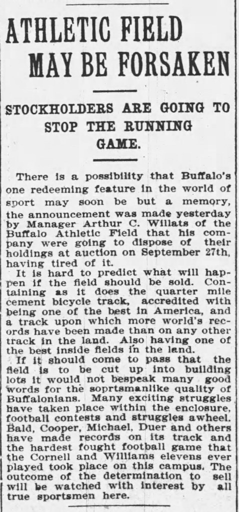 The Athletic Field will be cut into building lots if bicycle races do not pay in 1904.