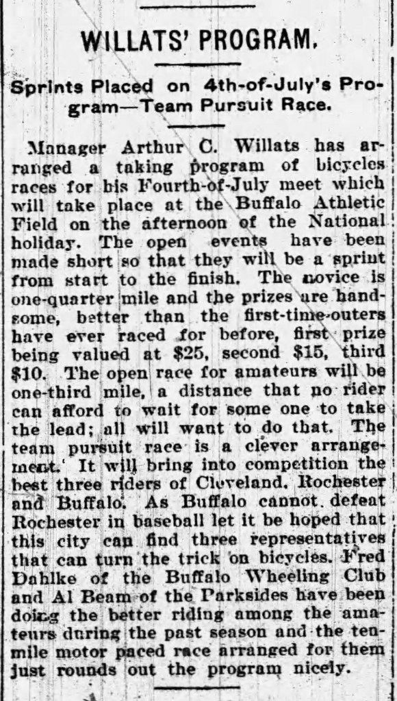 Arthur was mentioned in a Article called “RACERS AND A "BLAT." which was printed in Buffalo Courier on Wednesday 8th July 1896. Below is part of the article that mentioned Arthur.