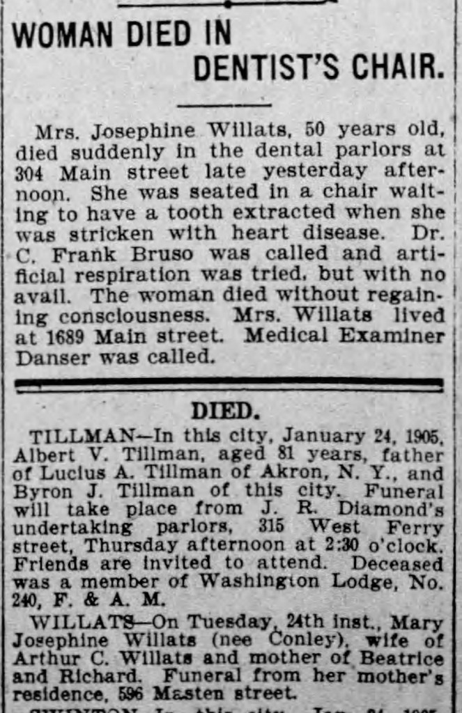 Mrs. Josephine Willats, 50 years old, died suddenly in the dental parlors at 304 Main street late yesterday afternoon. She was seated in a chair waiting to have a tooth extracted when she was stricken with heart disease. Dr. C. Frank Bruso was called and artificial respiration was tried, but with no avail. The woman died without regaining consclousness. Mrs. Willats lived at 1689 Main street. Medical Examiner Danser was called.