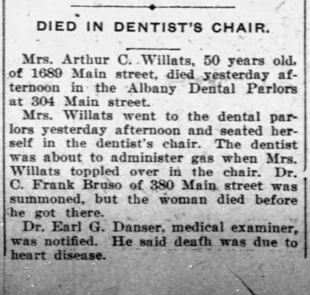 Mrs. Willats went to the dental parlours yesterday afternoon and seated herself in the dentist's chair. The dentist was about to administer gas when Mrs. Willats toppled over in the chair. Dr. C. Frank Bruso of 380 Main Street was summoned, but the woman died before he got there.
