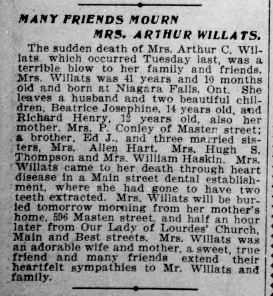 Mrs. Willats was 41 years and 10 months old and born at Niagara Falls, Ont. She leaves a husband and two beautiful children, Beatrice Josephine, 14 years old, and Richard Henry, 12 years old, also her mother, Mrs. P. Conley of Masten street; a brother. Ed J., and three married sisters, Mrs. Allen Hart, Mrs. Hugh S. Thompson and Mrs. William Haskin. Mrs. Willats came to her death through heart disease in a Main Street dental establishment, where she had gone to have two teeth extracted. Mrs. Willats will be buried tomorrow morning from her mother's home, 596 Masten Street, and half an hour later from later from Our Lady of Lourdes’ Church, Main and Best streets.