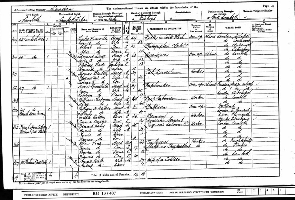 Just under a year later, the 1901 census was completed. It shows Lilly and William were residing at The French Horn Tavern, Lambeth Walk, Lambeth, London, England, on Sunday 31st March 1901. William was a Publican. 25-year-old Barman Joseph Sutton and 29-year-old Domestic Labour, Emma Anstee were residing with them.