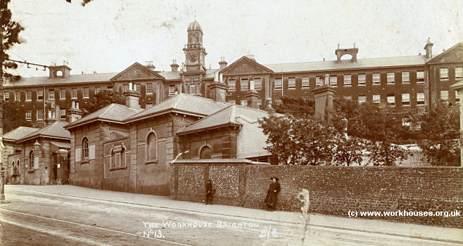 Elm Grove Workhouse The foundation stone at the new workhouse on Race Hill at Elm Grove in Brighton was finally laid on 11th April, 1865. Two and a half years later, on 12th September 1867, the building was finished at a cost of £41,000. Soon afterwards, all the inmates were transferred from the Church Hill workhouse, with the old building was demolished soon afterwards. The vacant site was then sold off for the construction of prestige housing. The sale of the land and materials raised £42,000, providing the Guardians with an overall profit of £1,000 on their transfer from one workhouse site to another. The new workhouse was designed by the London firm of JC & G Lansdown of Charing Cross, in conjunction with local man George Maynard. The site location and layout is shown on the OS map of 1897. The impressive main block at the north of the site, was T-shaped in plan. Its frontage was four storeys with a central clock tower. The building was divided into separate sections for male and female inmates by means of iron gates in the corridors. The building employed a system of artificial ventilation. The projecting wing at the centre of the main block included a large chapel. An infirmary was located the south-west of the site, with a lunatics' block to its east. Other blocks included casual wards, and foul and fever wards at the north-east of the workhouse. In 1880, three acres of land was purchased to the west of the workhouse on which new casual wards were erected in 1885, followed by infirmary pavilions at the south-west. From 1904, to protect them from disadvantage in later life, the birth certificates for those born in the workhouse gave its address just as 250 Elm Grove, Brighton. By 1910, the workhouse had a scheme of classification, under which some thirty or so of the best conducted male inmates were housed themselves in more comfortable quarters. Each of the men was also allotted a small plot of ground outside, in which they could garden and grow flowers for which prizes are given during the season. In 1914, the workhouse became known as Brighton Poor Law Institution. Between 1915 and 1920 it was taken over by the War Office and operated as the Kitchener Indian Hospital accommodating sick and wounded Indian soldiers. In 1921, it reverted to use as a workhouse until 1930 when it became Brighton Municipal Hospital. In 1948, it became part of the National Health Service and renamed Brighton General Hospital.
