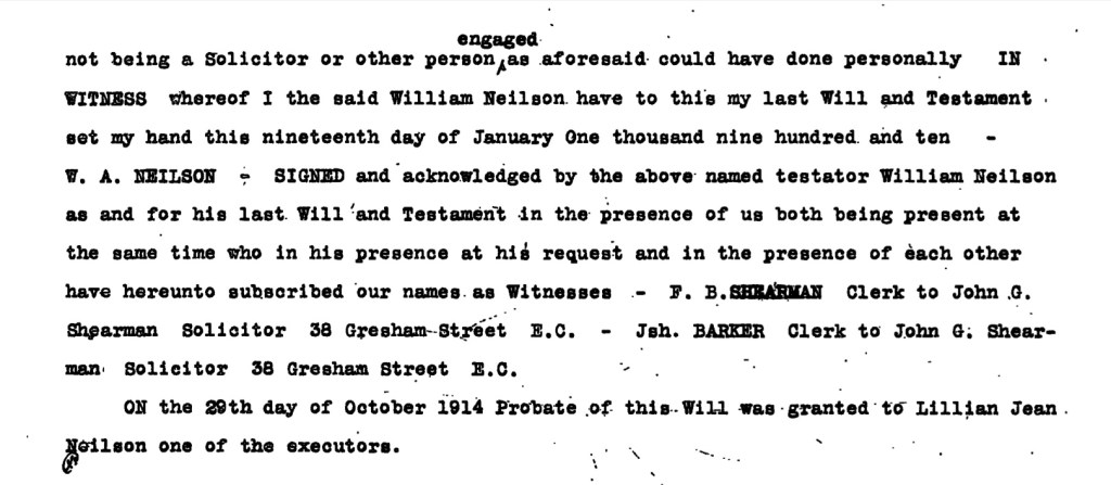 Lilly’s husband, William Alexander Neilson, had write his will on Wednesday the 19th of January 1910, at John G. Shearman Solicitor 38 Gresham-street. It reads as follows.