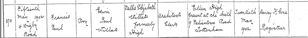 Edwin Paul and Nellie’s, son Francis Paul Willats, was born on Thursday the 15th of May, 1902, at Number 4, Digby Road, Hackney, London, England. Francis’s. Grandmother Ellen High nee Bushell, of Numcber 9, Felixstone Road, Tottenham, was present and registered his birth on Tuesday the 20th of May 1909. She gave Francis’s father, Edwin Paul Willats occupation as a Architects clark