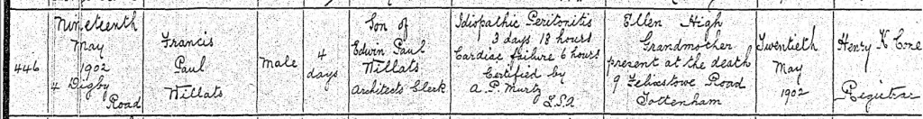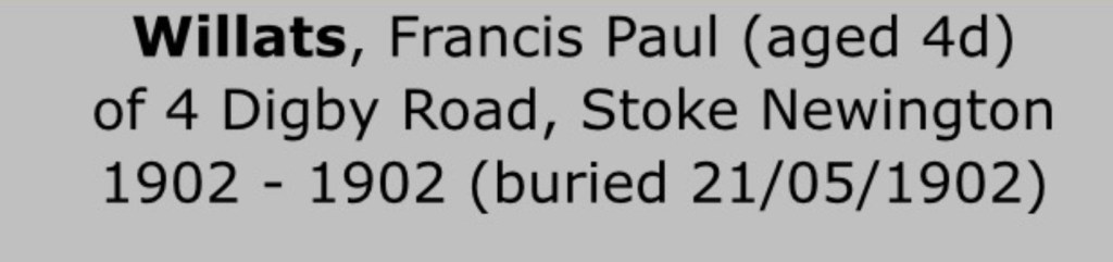 The following day, Architects Clark, Edwin Paul and Nellie Elizabeth Willats son, 4-day-old, Francis Paul Willats sadly died on Monday the 19th of May 1902, at Number 4, Didby Road, Hackney, London, England.