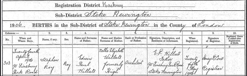 Edwin Paul and Nellie Elizabeth Willats nee High’s son, Stephen Roy Willats, was born on Tuesday the 24th of April, 1906 at Number 95, Finsbury Park Road, Stock Newington, Hackney, London, England. Edwin Paul registered Stephen's birth on Friday the 25th of May 1906, in Hackney, London, England. He gave his occupation as an Architect and their abode as Number 95, Finsbury Park Road, Stock Newington.