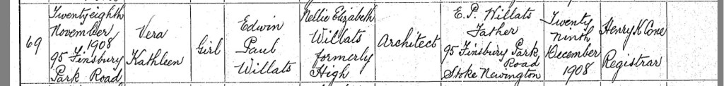 Back in England, Edwin Paul and Nellie Elizabeth daughter, Vera Kathleen Willats, was born on Saturday the 28th of November 1908, at Number 95, Finsbury Park Road, Stock Newington, Hackney, London, England.