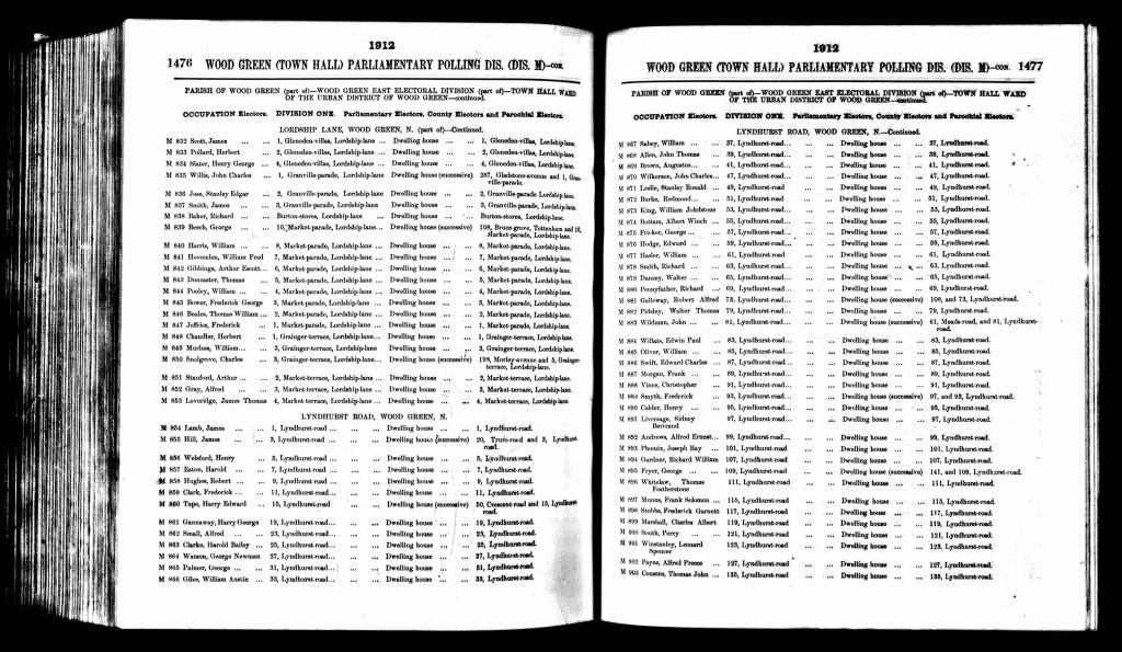The 1912 London, England, Electoral Registers, shows Edwin was residing at Number 83, Lyndhurst Road, Wood Green, Haringey, Tottenham, England, in the year 1912.