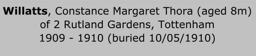 Tragically, Percy and Sophia’s joy was heartbreakingly brief. Their beloved daughter, 8-month-old Constance Margaret Thora Willats, passed away on Thursday, the 5th of May, 1910, at the family home at Number 2, Rutland Gardens, Tottenham, Edmonton, Middlesex, England. Little Constance succumbed to bronchitis pneumonia after a brave struggle lasting ten days.