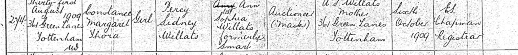 Percy Sidney Willats and Sophia Ann Willats nee Smart, firstborn daughter, Constance Margaret Thora Willats was born on Tuesday the 31st of August 1909, just over a month after they wed. Constance was born at Number 361, Green Lanes, Tottenham, Edmonton, Middlesex England.
