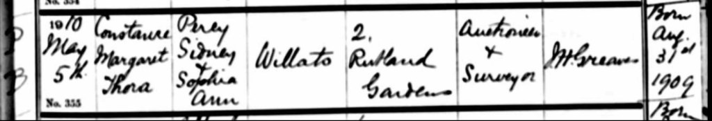 Percy and Sophia privately baptised Constance Margaret Thora Willats, on Thursday the 5th of May 1910, at St. Paul, Harringay, Middlesex, England. Her father Percy, occupation was given as a auctioneer and surveyor, and their abode to Rutland Gardens.